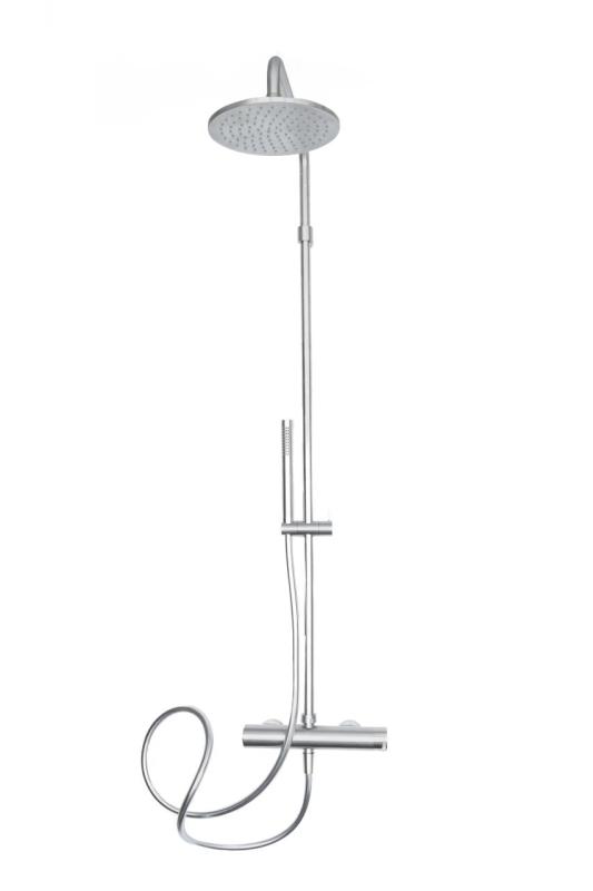 Brusekombinationen er fremstillet af højkvalitets messing og afsluttet med en holdbar forkromet belægning. Dette giver et luksuriøst udseende, fremragende slidstyrke og langvarig pålidelighed. Det rene design passer perfekt ind i moderne og designorienterede badeværelser.