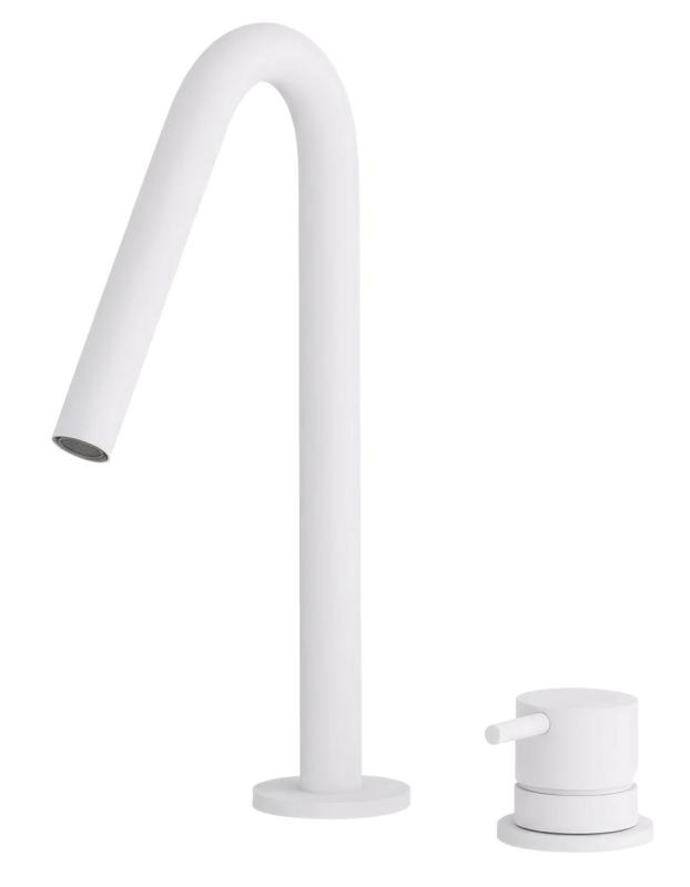The Waterevolution Flow 2-hole basin tap in matte white with a small V 120mm spout (model T1121VBR) is a beautiful addition to any bathroom. With its sleek design and modern look, this tap adds a touch of luxury to your basin.